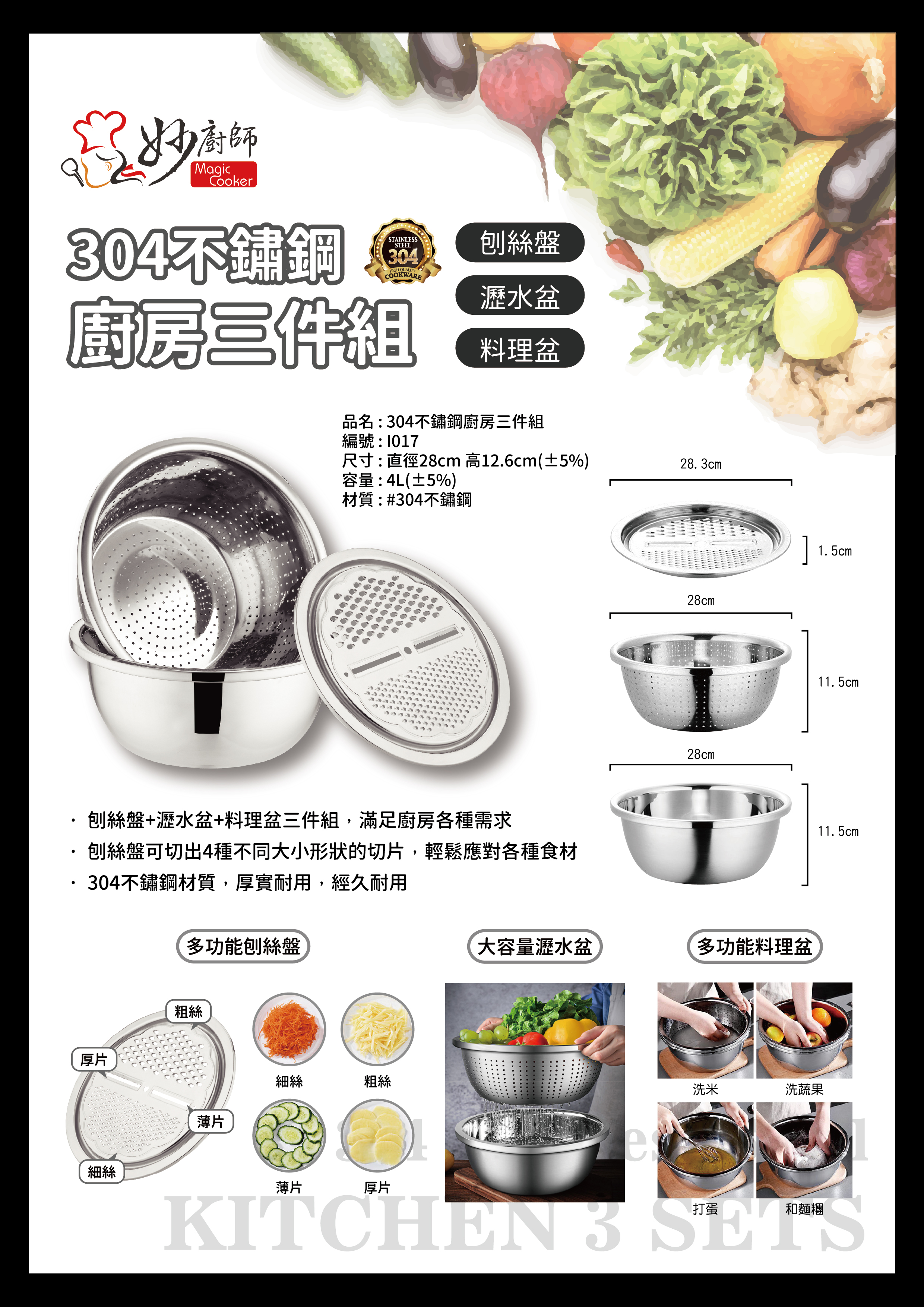 ◆刨絲盤+瀝水盆+料理盆三件組,滿足廚房各種需求